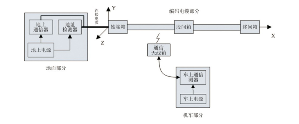 地上位置檢測與通信系統(tǒng)是利用電磁感應原理來實現(xiàn)位置檢測和數(shù)據(jù)通信的。它由地面部分、編碼電纜部分、車上部分組成。其中地面部分由地上通信器、地址檢測器、地上電源組成;編碼電纜部分由始端箱、編碼電纜、段間箱、終端箱組成;車上部分由車上電源、車上通信器、天線箱組成。