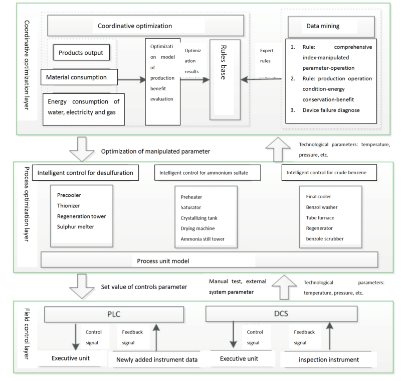 On the basis of intelligent control platform of coking integration, the system consists of desulfuration subsystem, ammonium sulfate and ammonia stilling subsystem, crude benzene subsystem, and underlying device control subsystem, which takes control of key parameters and predicts them intelligently, and provides interlocking operation and status diagnosis to underlying devices. By coordination and optimization, the system is able to take control of underlying devices and process automatically and stably ,and make top management coordination optimized , so as to improve production, reduce costs and raise the standard of management.